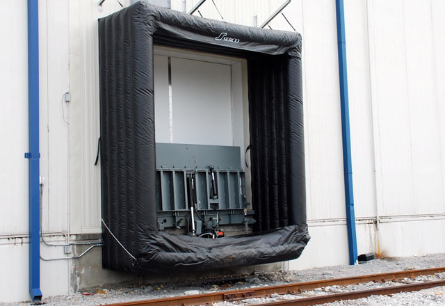 Serco rail shelters, available in mechanical and inflatable models, offer a protected connection between a railway car and your loading dock to protect cargo from outside elements. Rail shelters suspend on a steel frame and have steel extension arms to cover gaps between docks and rail cars.