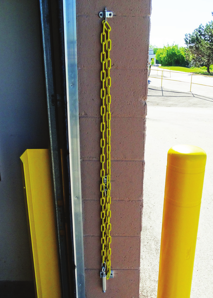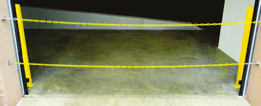 APS Dual Chain solution offers a low-cost safety option to comply with the OSHA fall protection standards. The system consists of two high visibility yellow security chains made of high visibility yellow powder-coated steel, anchored in aluminum rings from opposite sides of the loading dock door frame to pre-attached turnbuckles.